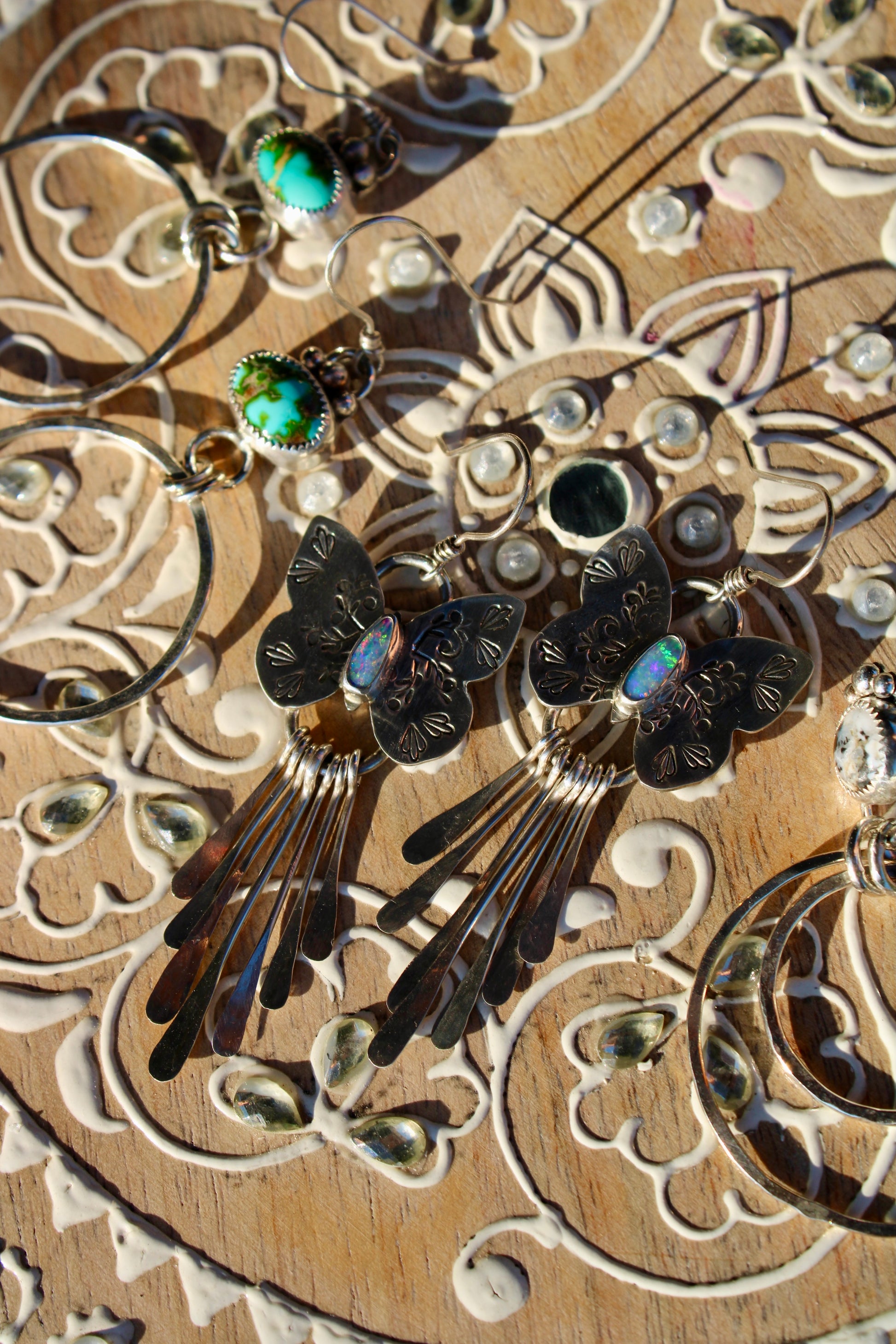 Handcrafted in sterling silver with hand stamped details, adorned with Opal Doublets. Like their wings, each fringe is handcrafted, unique and attached one by one.