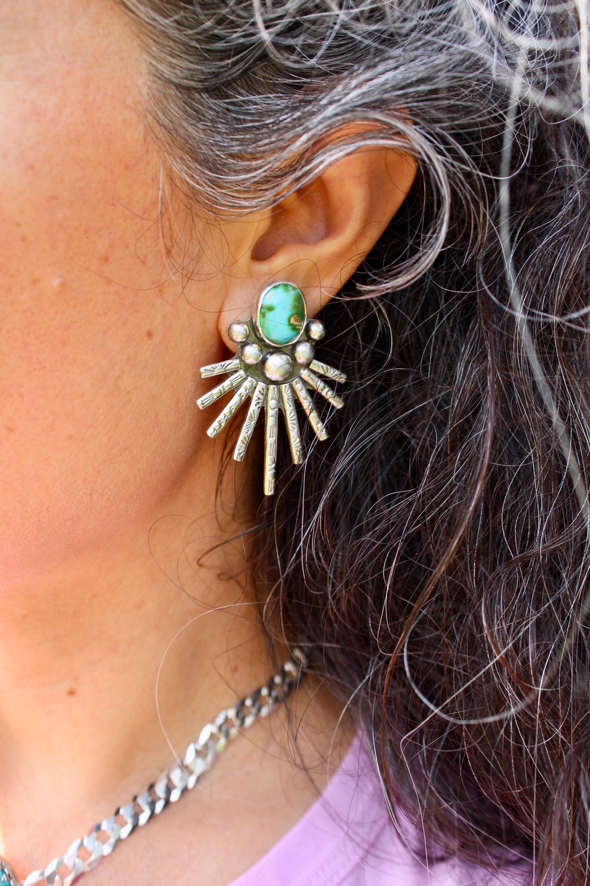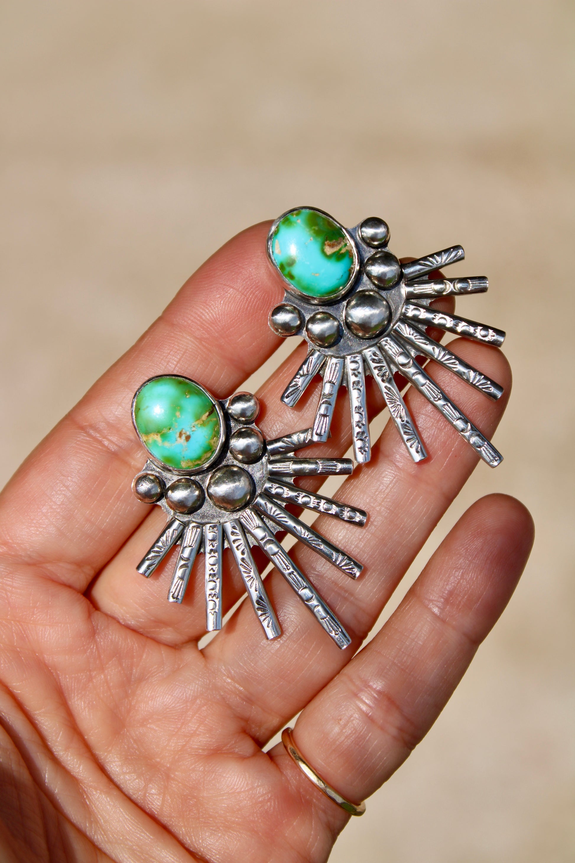 One of my favorites to make! All handcrafted in sterling silver with hand stamped details, adorned with chunky Sonoran Mountain Turquoise.