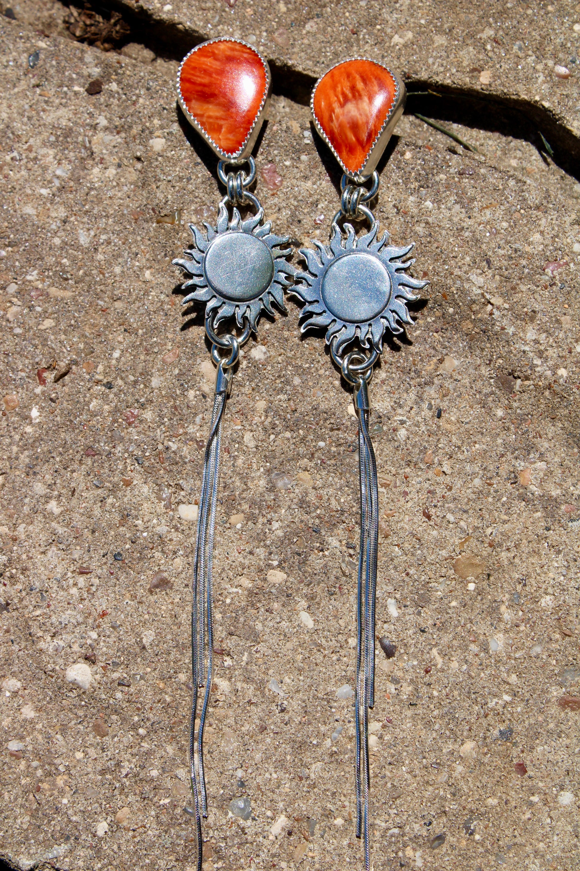 The magical colors of the golden hour! Handcrafted sterling silver sun charms adorned with Spiny Oyster and snake chain tassels!