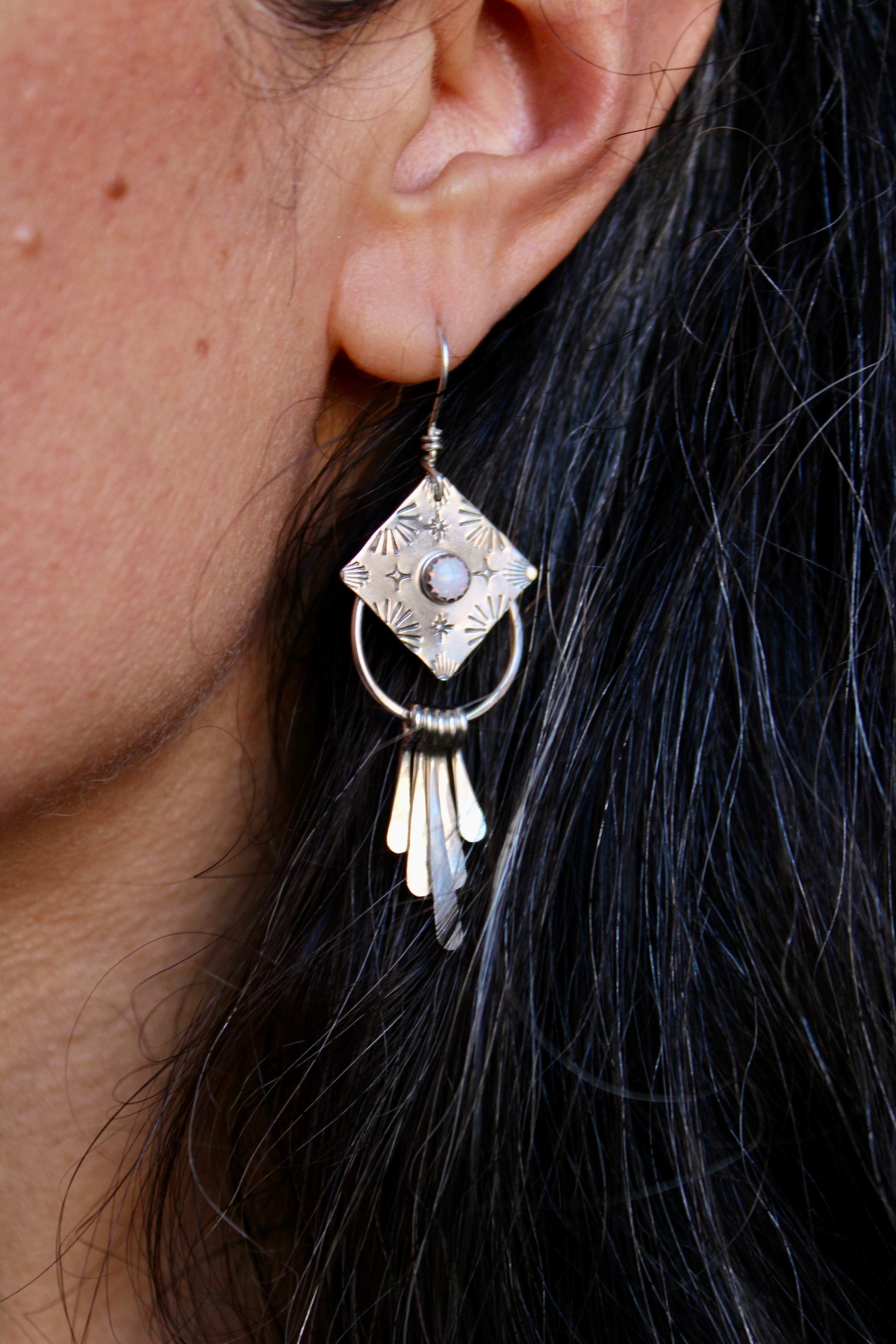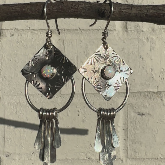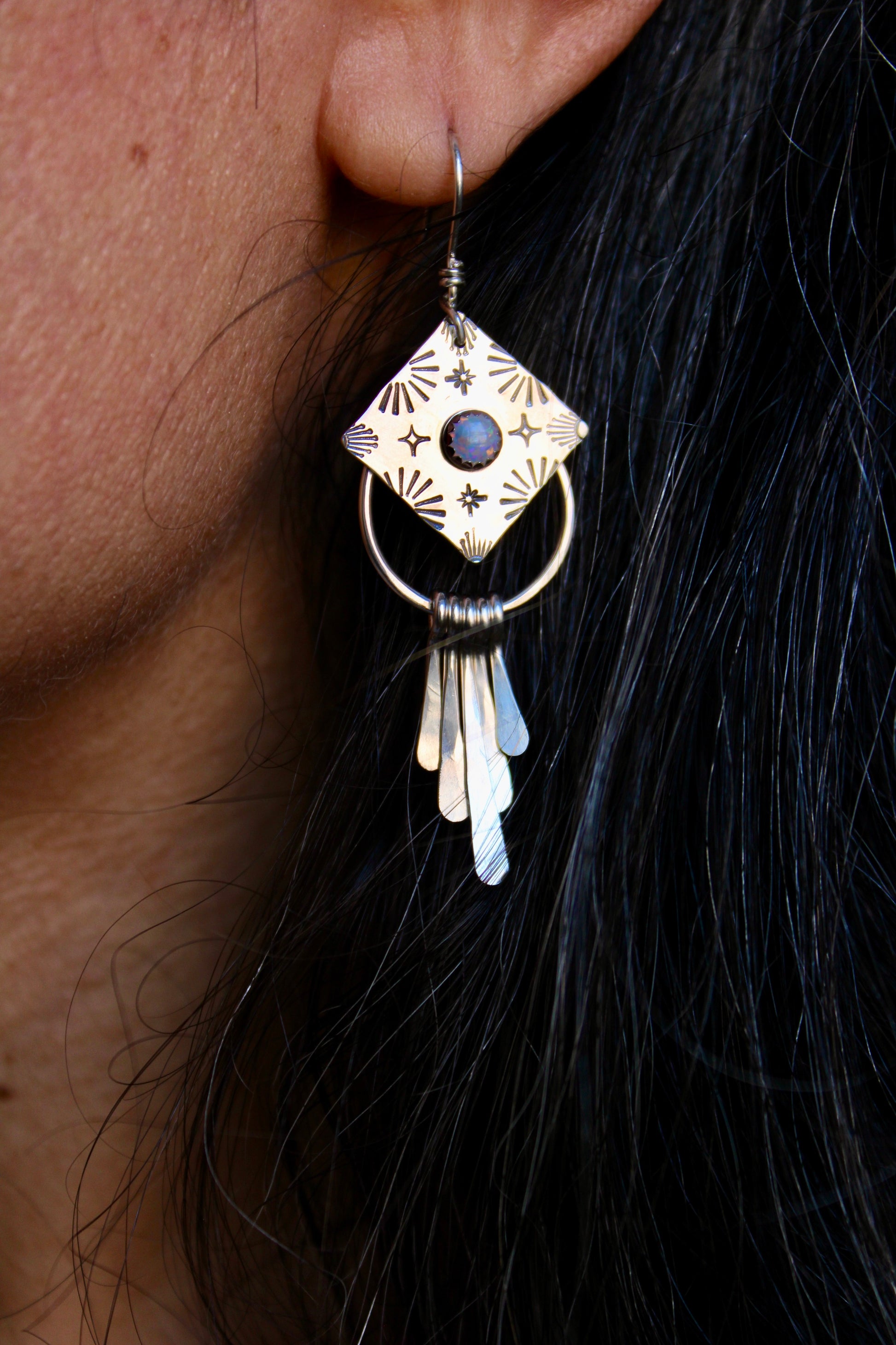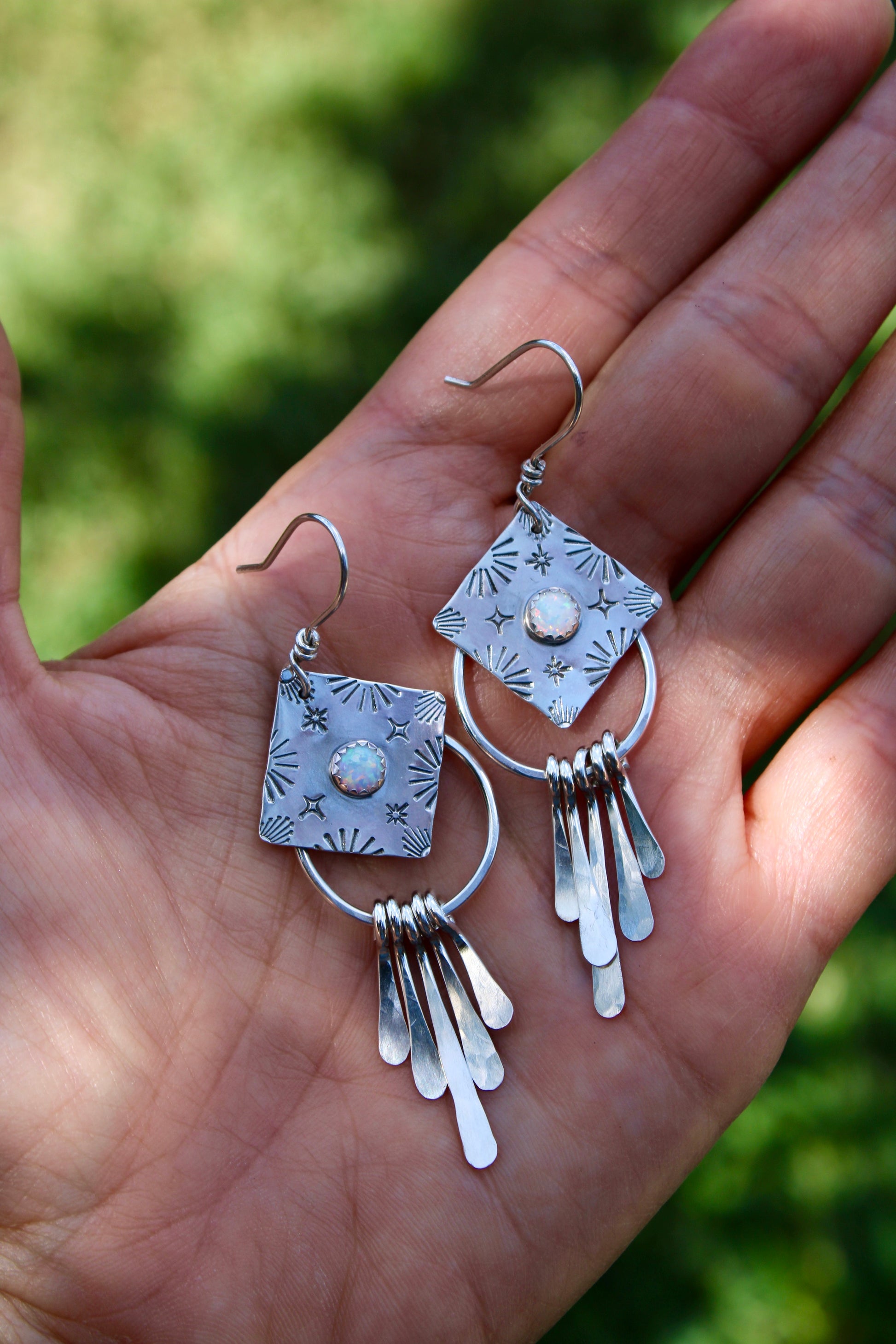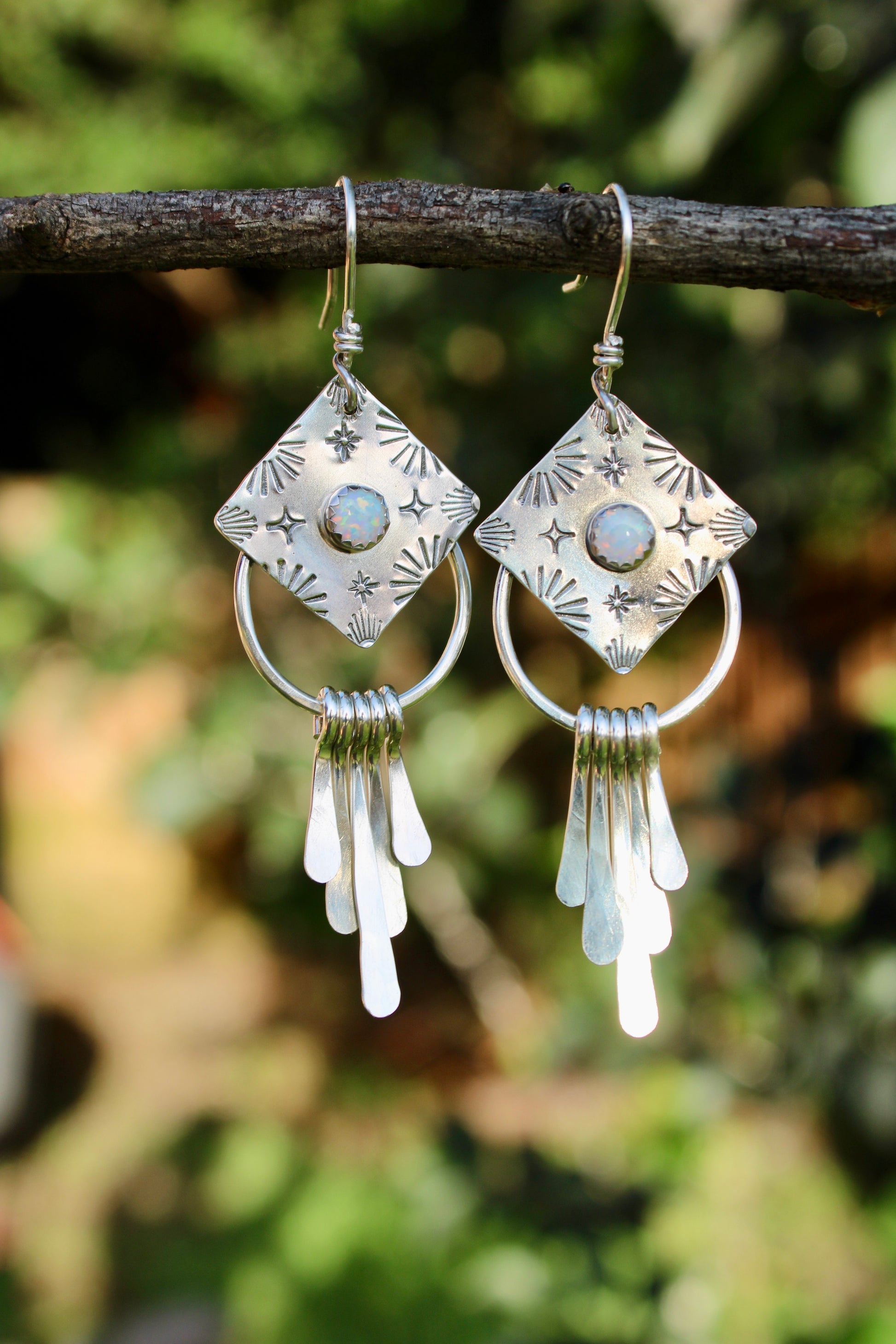 Handcrafted in Sterling Silver, hand stamped details and handcrafted fringes and ear wires. Adorned with Kyocera Opals.