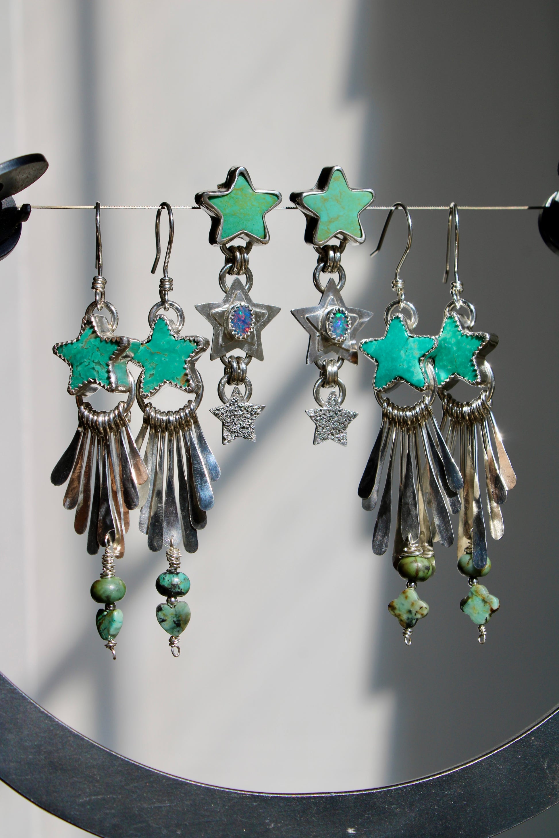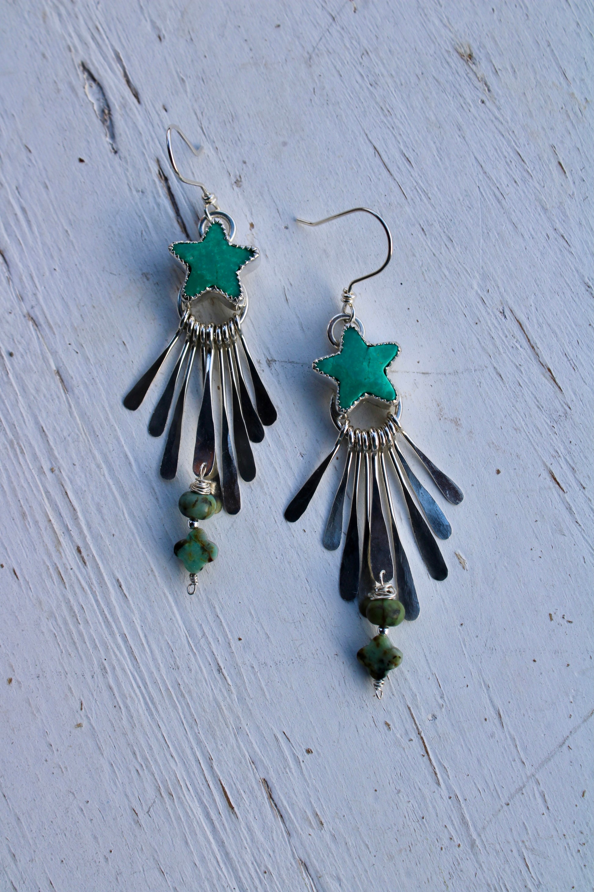 Chilean Turquoise stars with mini African Turquoise, these are handcrafted in sterling silver with fringes attached one by one, also hand crafted in sterling silver.